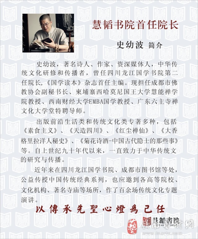 慧韬书院之创建,以继承传统书院之全体精神为己任,以融通现代传播理念为手段,涵彻古今,横贯中西,使传统书院亘古不易之圣贤精神,在现代社会得以再生,并枝繁叶茂。